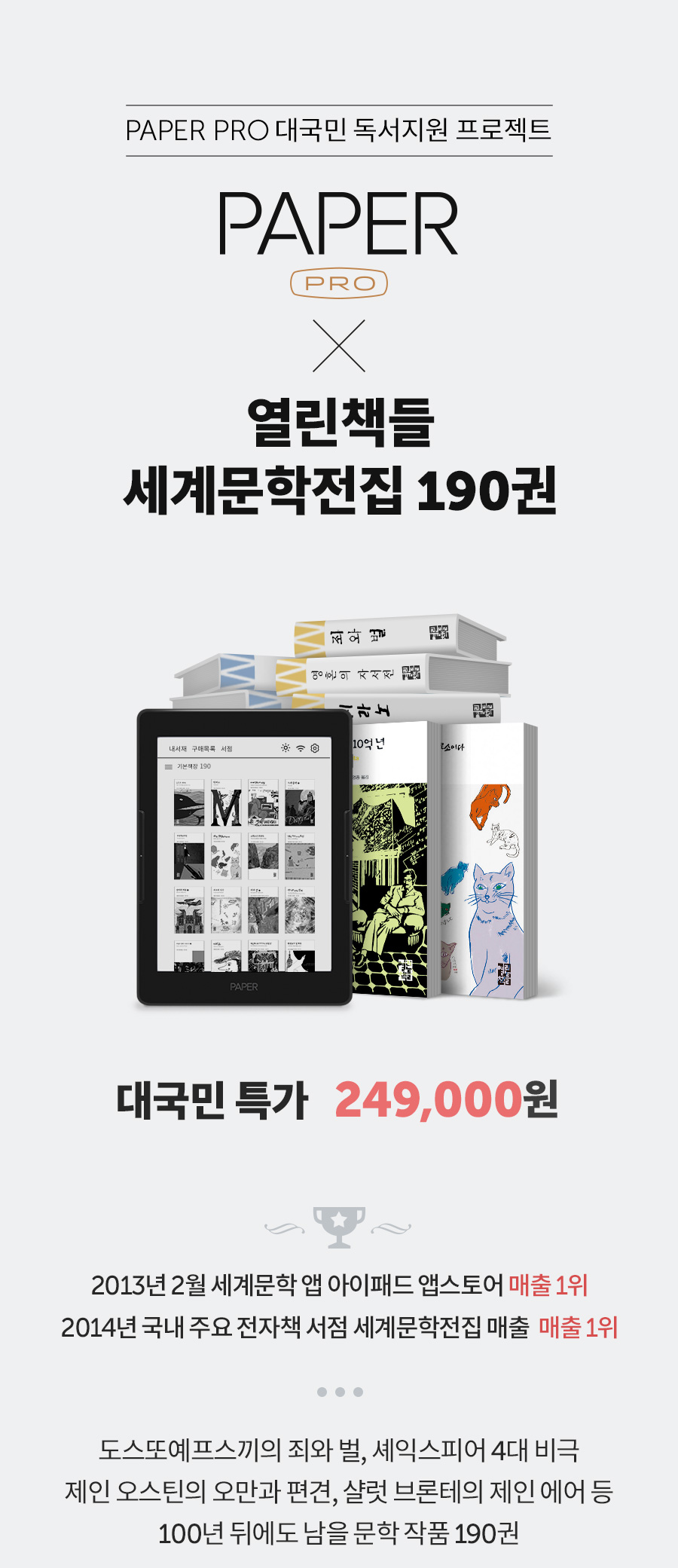 PAPER PRO×대국민 독서지원 프로젝트 PAPER PRO 기기 단품 5만원 할인 특가! 199,000원 PAPER PRO×열린책들 세계문학전집 190권 세트 249,000원