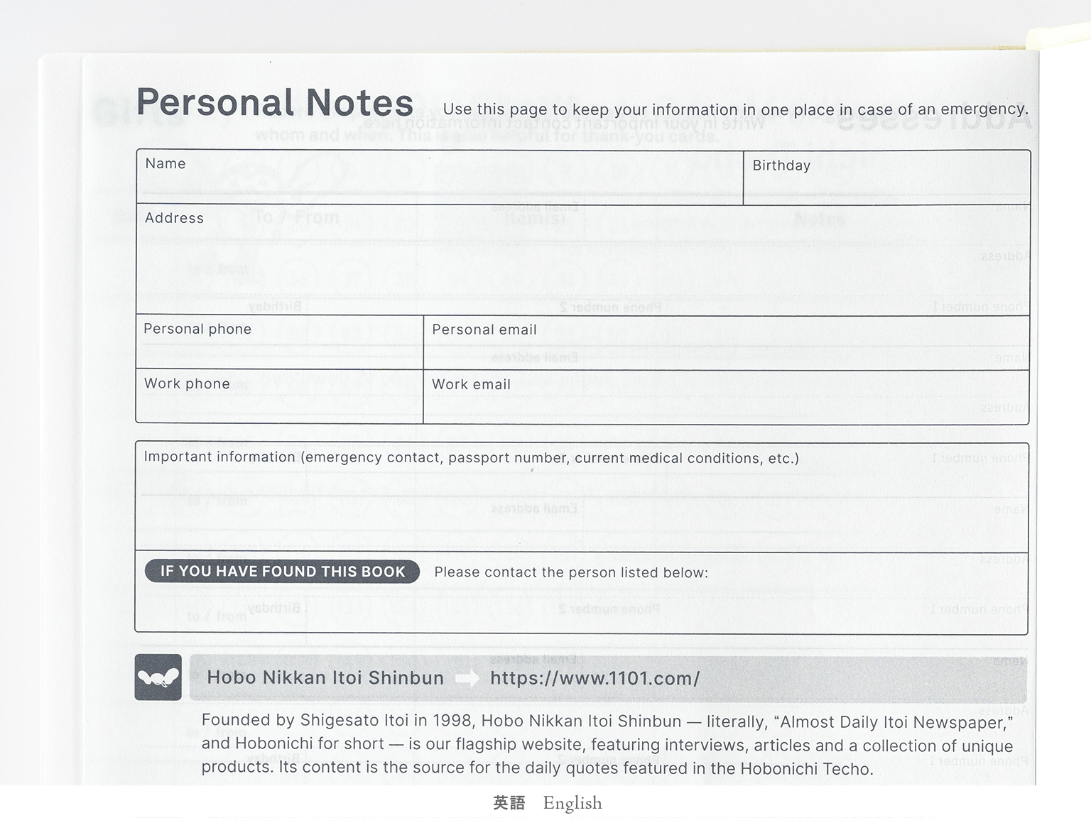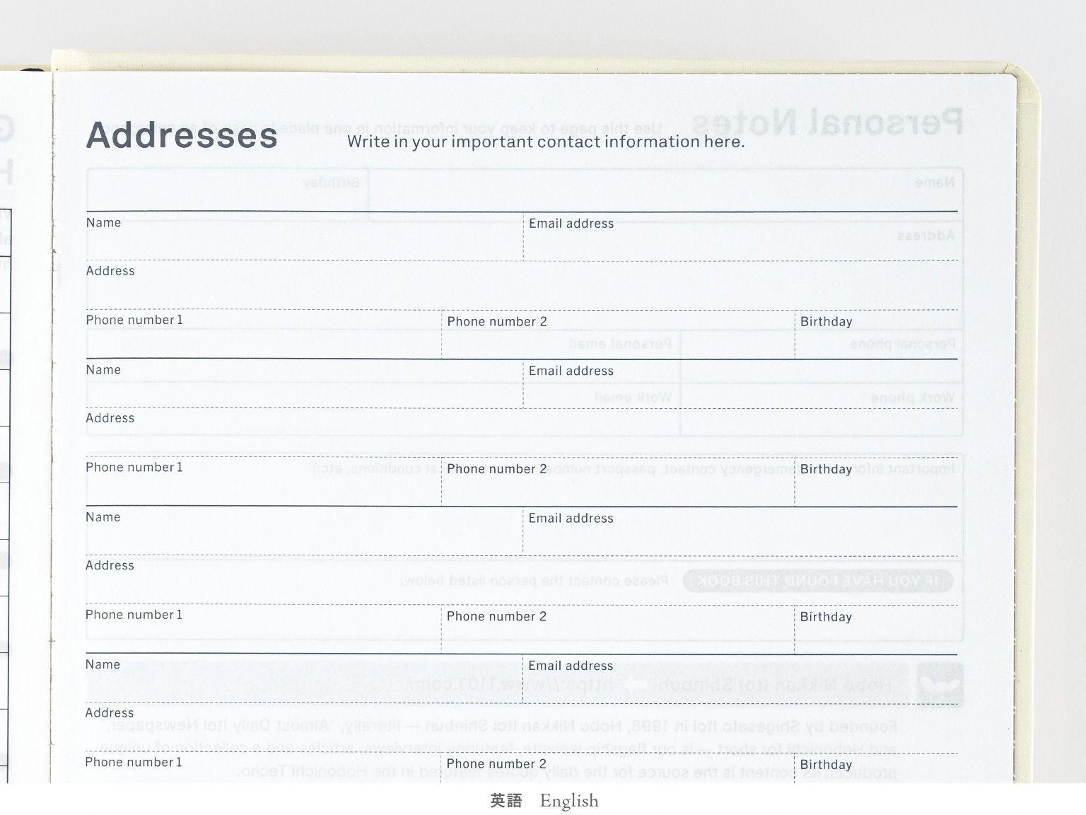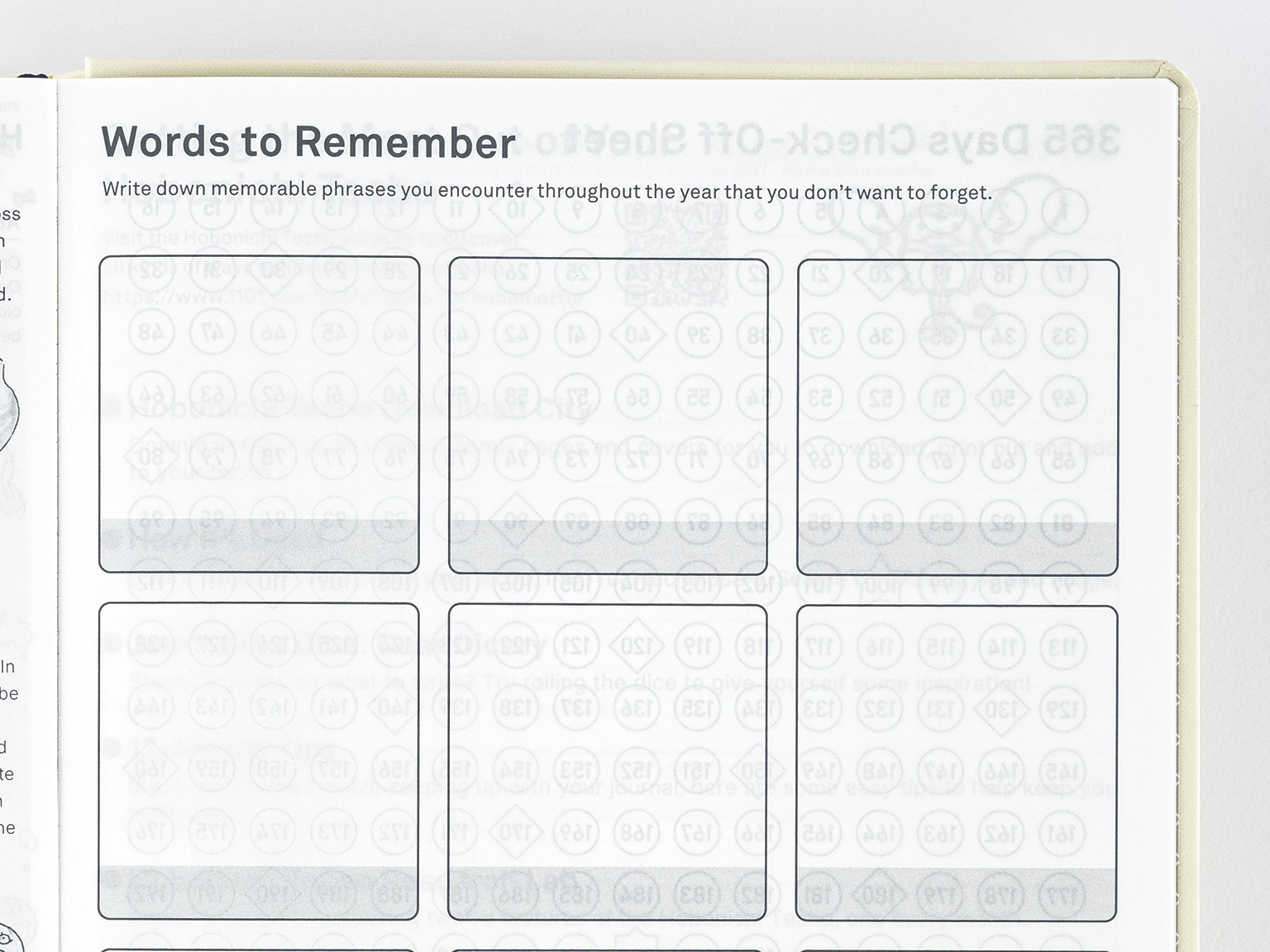 | Bonus Pages | Time Table / Graph Paper / Favorites / My 100 / Sample Symbols and Icons / How to Have Fun Keeping a Diary / Oodles of Noodles / Words to Remember / 365 Days Check-Off Sheet / Getting the Most Out of Your Hobonichi Techo / Gifts / Addresses / Personal Notes |