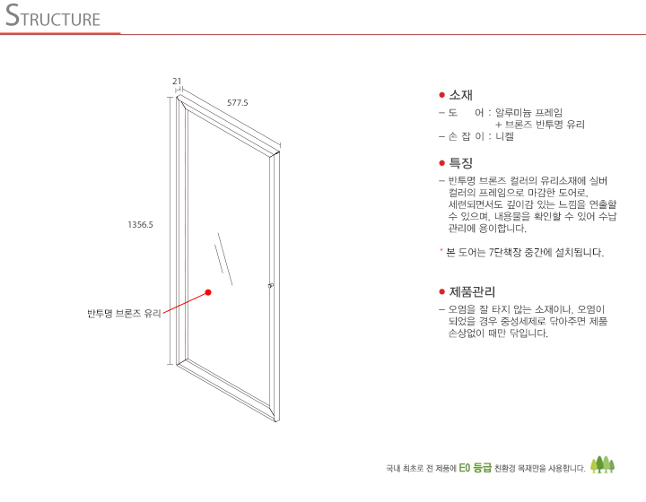 | 도어 | 18t PB 양면 LPM + 1.0t ABS 엣지 접착 마감 |